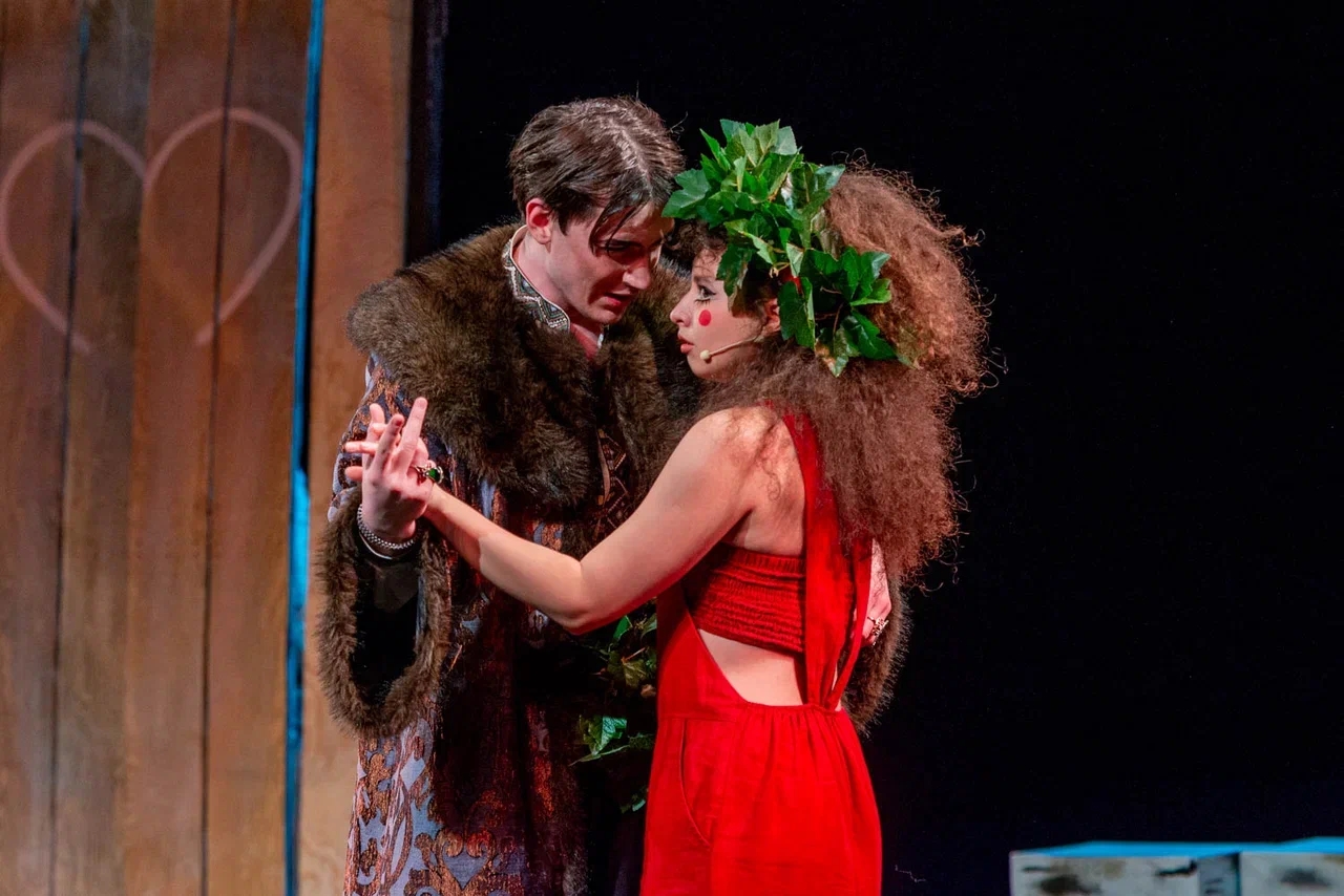 Ещё один объект притяжения, наверняка завороживший создателей спектакля, – это сама атмосфера идиллического, исконного, мудрого мира сказочных берендеев с их обычаями, верованиями и игрищами. Однако, нырнув в глубину веков, ребятам удалось уважительно и деликатно осовременить этот условный архаичный мир. Поэтому жанр постановки и был определён как неофолк-драма. Практически не изменив чудесного поэтичного текста Островского, актёры периодически свободно выныривали из времени и своих образов с помощью всяких разных сценических деталек. Мимолётное отстранение от персонажей, неожиданные реакции, жесты, лукавый взгляд, мимика, междометия и прочие выразительные актёрские тонкости не только придавали истории озорство и игривость, но и делали её соразмерной сегодняшнему молодёжному восприятию мира. Справедливый и мудрый Берендей (Максим Шарапов), по сценарию косой на один глаз, то и дело забывал его прищуривать и засыпал на ходу, разрисовывая лазоревый цветочек. Прекрасная Елена (Ульяна Лемешко) периодически выходила из образа строгой неприступной красавицы и приставала к чужим мужикам или переходила в увлечённом танце почти на тверк; в любовной страсти один персонаж грозил сменить романтику на криминал и в буквальном смысле задушить другого в объятьях. Снегурочка впервые явилась зрителю не в образе холодной красавицы, а в виде детской механической куклы с движениями робота: неповоротливая, втиснутая в современную цигейковую шубку, она напоминала закутанного по брови послушного толстого мальчика из анекдота: – Мам, я уже замёрз? – Нет, сынок, ты уже хочешь кушать…